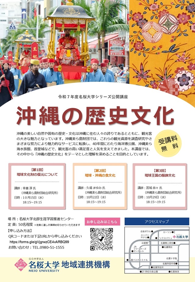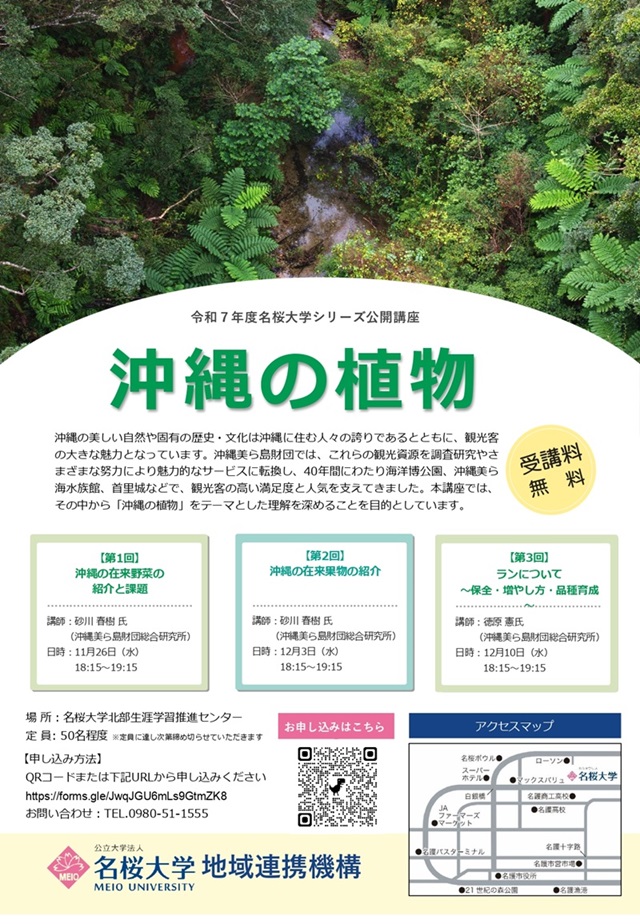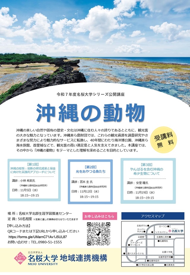 沖縄美ら島財団では、令和7年度名桜大学公開講座(シリーズ講座)において、「沖縄の歴史文化」「沖縄の動物」「沖縄の植物」「沖縄の博物館」の4つのカテゴリーで、研究者による分かりやすい解説を実施いたします。