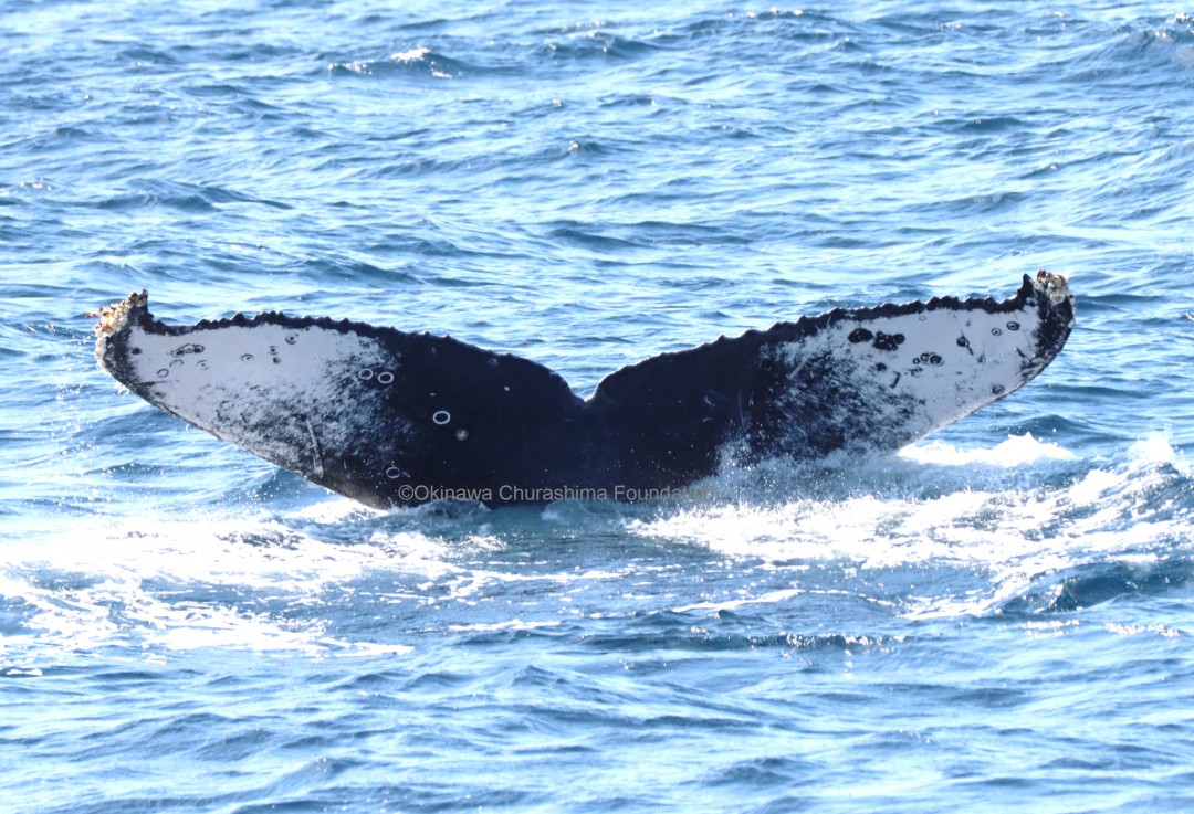 ザトウクジラの尾びれ腹面の模様は真っ白いもの、真っ黒いもの、白黒混ざったものなど個体により様々で、これを利用し個体識別をすることができます。当財団では、30年以上に及ぶ調査により約2000頭の個体を識別しています。昨シーズンは慶良間海域と本部海域の調査でのべ348個体の尾びれ写真を撮影することができました。さて、今シーズンは何頭のクジラに出会えるでしょうか!?