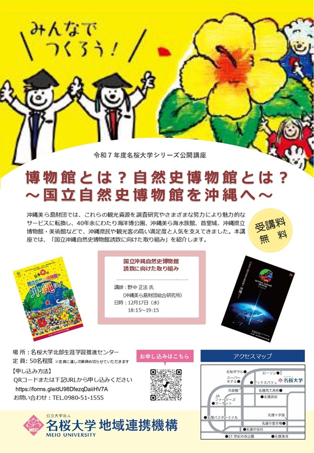 沖縄美ら島財団では、令和7年度名桜大学公開講座(シリーズ講座)において、「沖縄の歴史文化」「沖縄の動物」「沖縄の植物」「沖縄の博物館」の4つのカテゴリーで、研究者による分かりやすい解説を実施いたします。