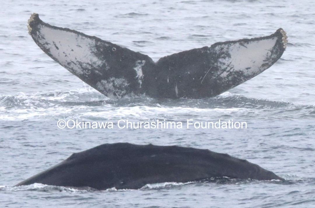 本日の本部海域では、写真のクジラ(識別番号:R-612)が確認されました。この個体は、2006年に仔クジラ(0歳)として初めて確認されて以降、何度も沖縄周辺海域への来遊が確認されています(2006〜2012年、2015年、2016年、2019年)。今年で20歳となる個体で、座間味などの一部ホエールウォッチング関係者の間では、「あゆみ」の愛称で親しまれています。また、R-612は背びれが欠損したようにも見える珍しい形状をしていることでも知られています(写真参照)。本日のR-612は、別の1頭とともに、伊江島西沖を2頭でのんびりと遊泳していました。