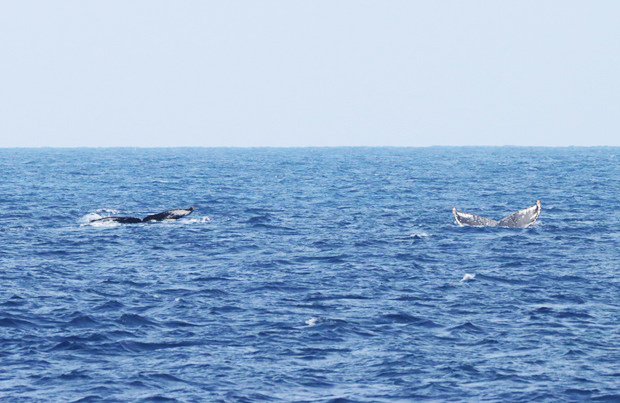 白い尾びれと黒い尾びれの2頭:伊江島南西沖にて